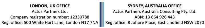 This website, www.actus.one, provides information about Actus Partners Group ("the Group"). Pages on this site are issued in the United Kingdom and therefore they are compliant with appropriate UK legislation and regulation. If appropriate, for any issues directly related to the Group's Australian office, the Australian Privacy Act 1988 will apply.